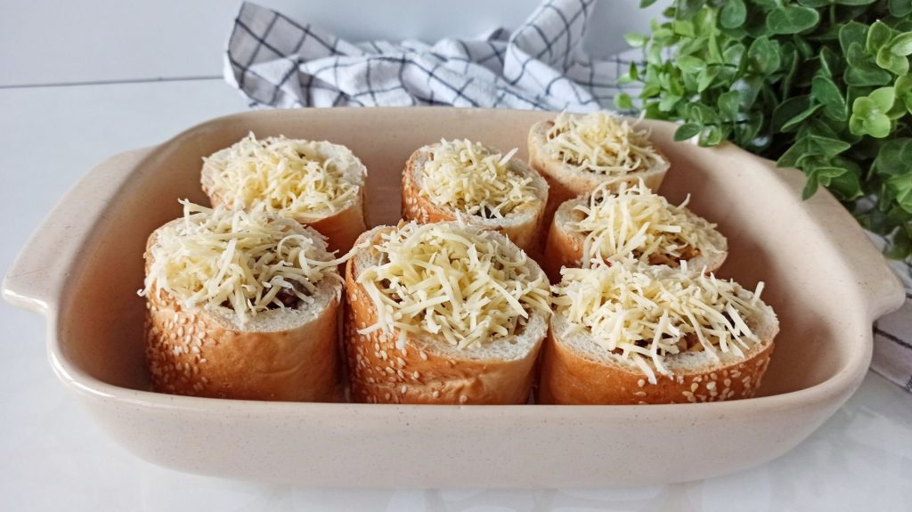 - Bak 25 minuten, totdat de baguettes de vloeistof hebben opgenomen en het gehakt gaar is