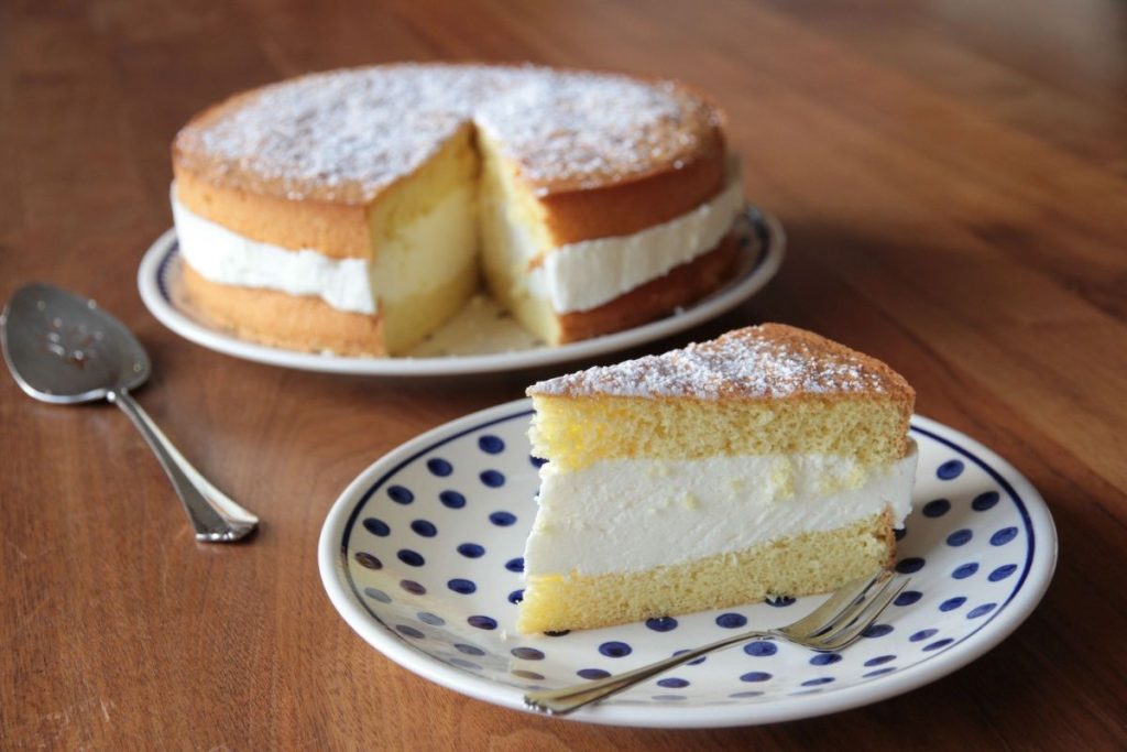 - Snijd de biscuit horizontaal doormidden, wikkel de ene helft in een taartring, smeer er kwarkcrème op en strijk deze glad. Leg het tweede deel van het deeg op de vulling en druk het voorzichtig aan.