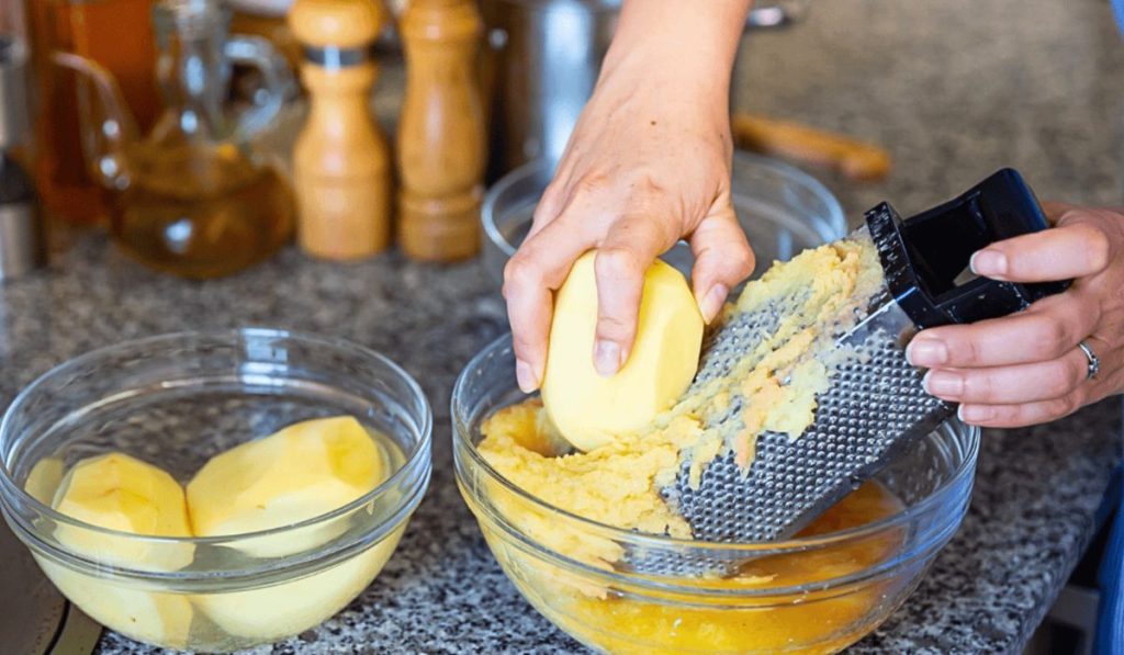 De eerste stap is het schillen van de aardappelen en de ui, en ze vervolgens op een fijne rasp te raspen. Vervolgens doen we ze in een zeef of gaas en drukken we het overtollige vocht er goed uit. Hierdoor krijgen de pannenkoeken een compactere structuur en worden ze knapperig.