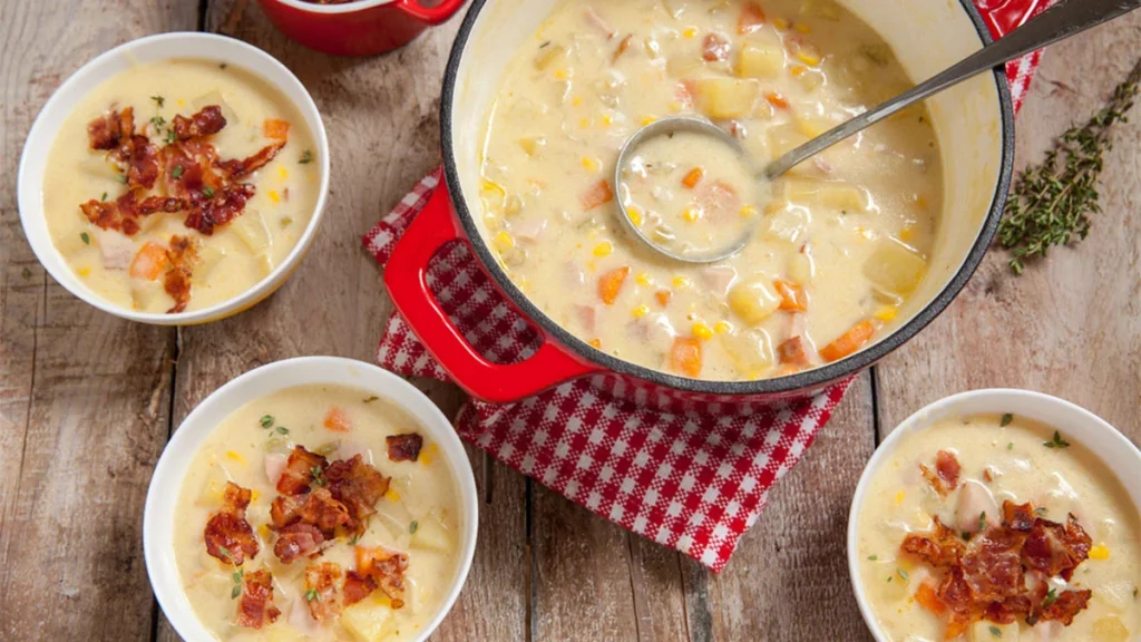 - Serveer gegarneerd met geraspte cheddar, spek, lente-uitjes en verkruimelde Ritz-crackers.