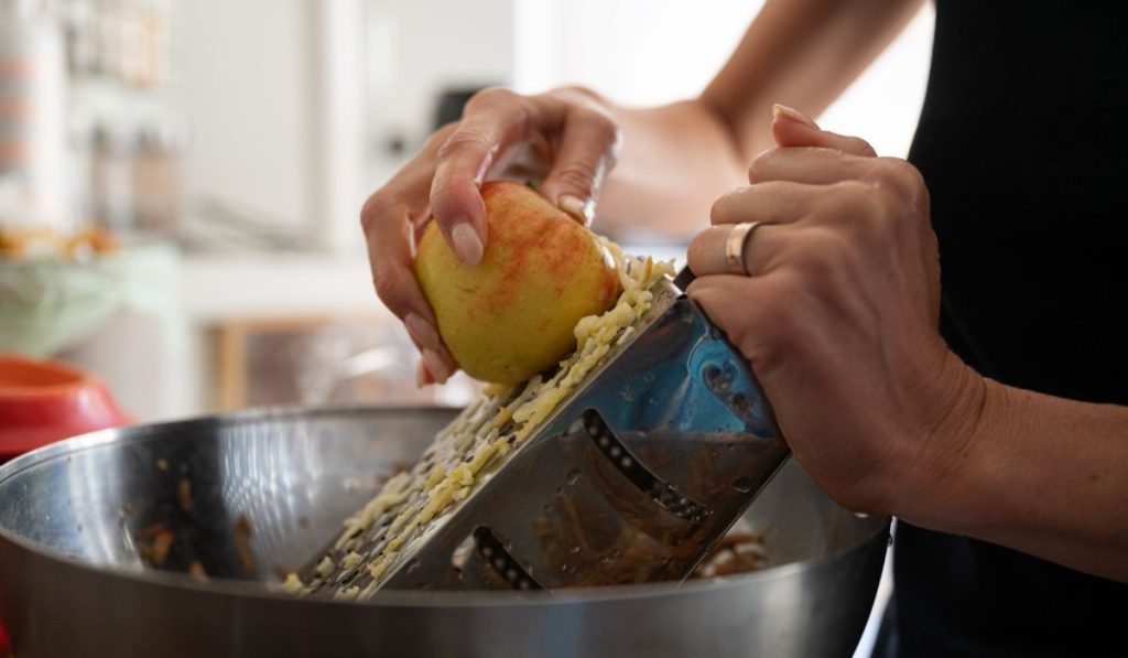 Was de appels, schil ze, verwijder het klokhuis en rasp ze grof. Voeg het ei en de bloem toe en kneed alles tot een deeg. Laat het deeg ongeveer 15 minuten rusten.